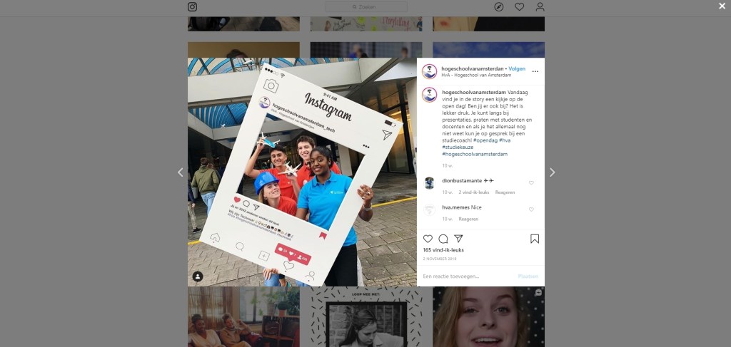 In deze post van de hogeschool van Amsterdam nodigt het HVA de doelgroep uit om naar de open dag te komen door middel van een leuke foto waarin blije studenten te zien zijn. Het HVA zegt ook dat je langs kan bij presentaties en dat je kan praten met studenten en docenten. ook als je nog niet weet wat je wilt studeren kan je daar terecht voor een gesprek met een studiecoach om het net wat aantrekkelijker te maken.